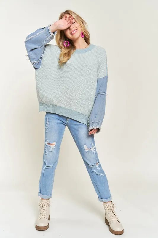 ADORA Plus Size Frayed Denim Sleeve Sweater Top