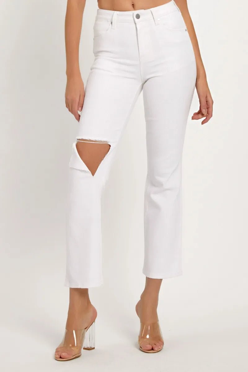Distressed cropped straight jeans are a trendy and versatile denim option. The distressed detailing adds a fashionable, worn-in look to the jeans, giving them an edgy and casual vibe. The straight leg cut offers a timeless silhouette that is flattering and easy to style with a variety of tops and shoes. The cropped length is perfect for showcasing your favorite footwear, whether it's sneakers, sandals, or boots. These jeans are great for creating on-trend and casual outfits for everyday wear.